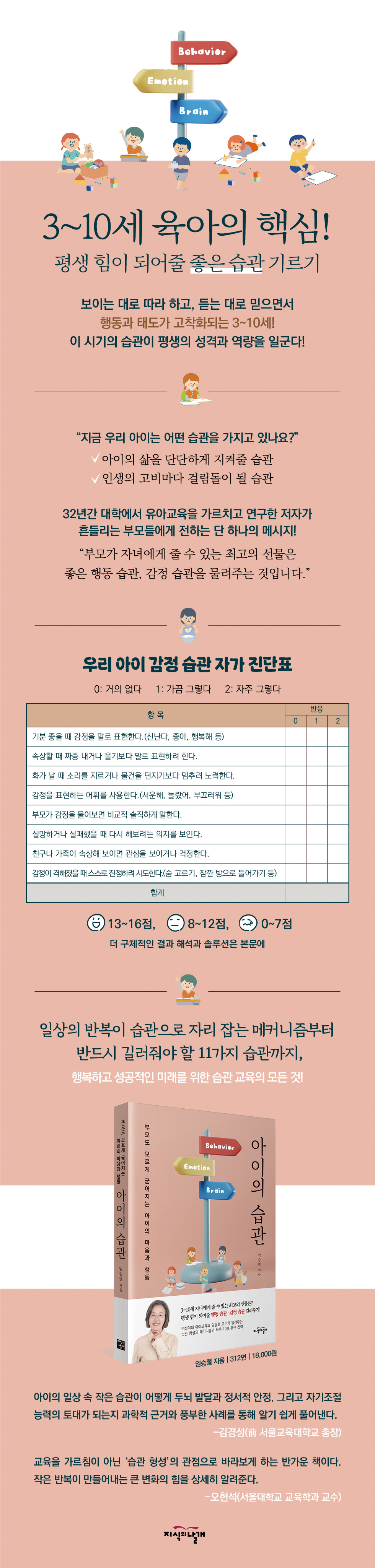 습관은 “제2의 천성”이라 불릴 만큼 막강한 힘을 지니지만, 좋은 습관을 만들기란 좀처럼 쉽지 않다. 나쁜 습관이 늘 한발 앞서 몸과 마음을 점령해 버리기 때문이다. 그래서 좋은 습관은 한 살이라도 어릴 때 들여야 한다.